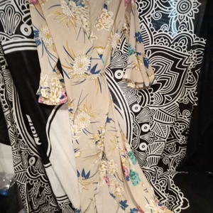 Very pretty wrap dress. Colourful flowers on cream background. Material Polyester. Three quarter sleeve with frill. Bust size 36" Length from nape of neck 45.5".