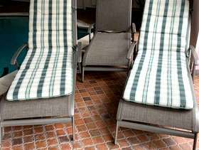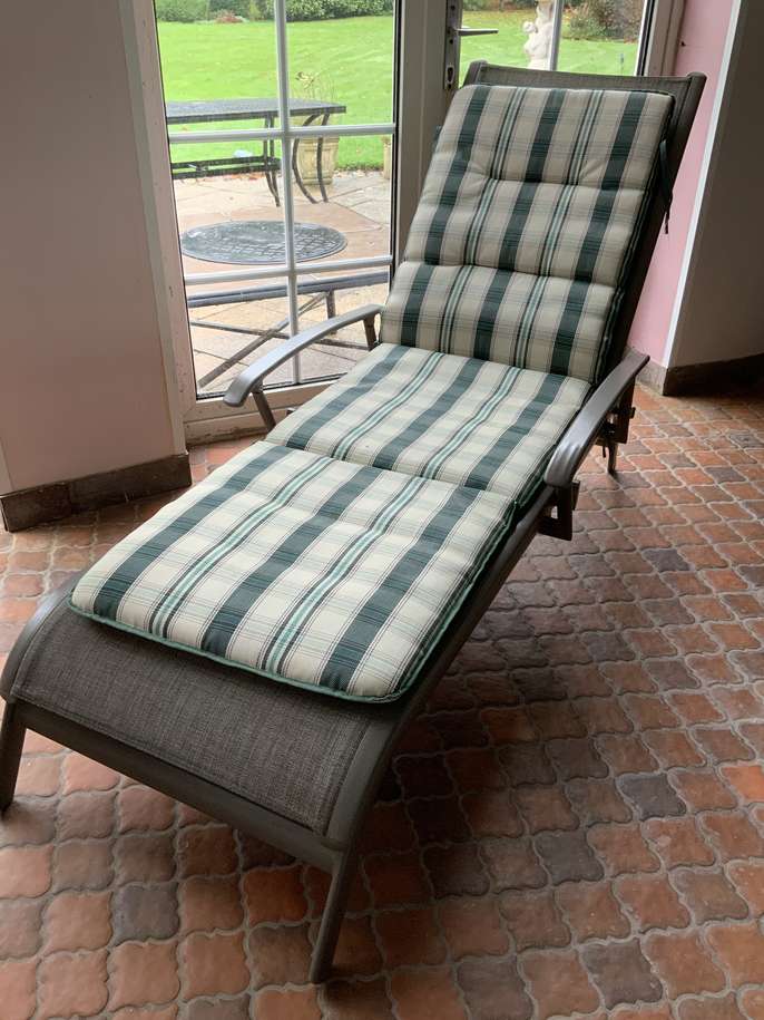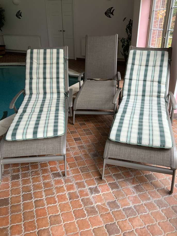 Three sun loungers and two water repellent cushions cover in as new conditions. Collection from Banstead SM7. All three for £100
