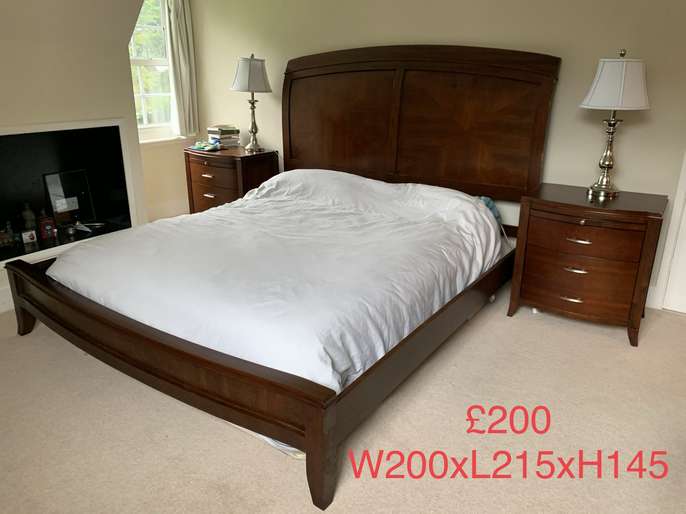 Solid cherry wood super king size bed. It’s been in storage. Also included base and mattress with some occasional use. W200xL215xH145 All from a smoke and pet free home. Collection from Banstead SM7