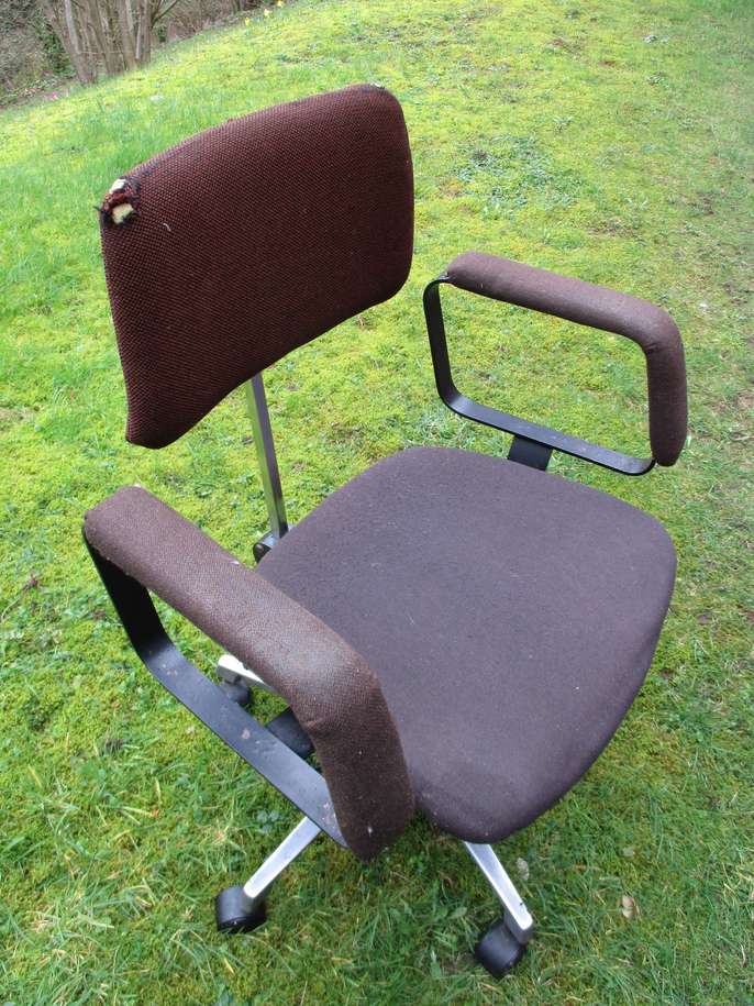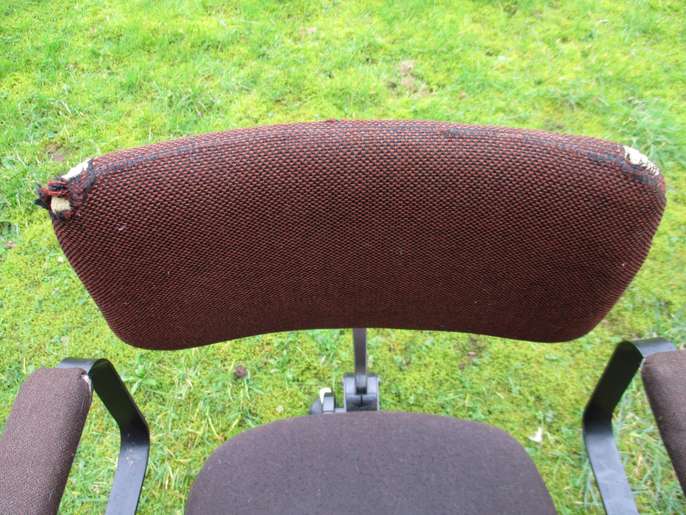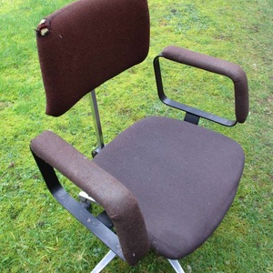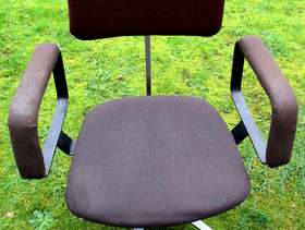 Swivel office chair with arms/castors. Adjustable for height & angle of back. Sturdily built– seat and arms have been recovered.