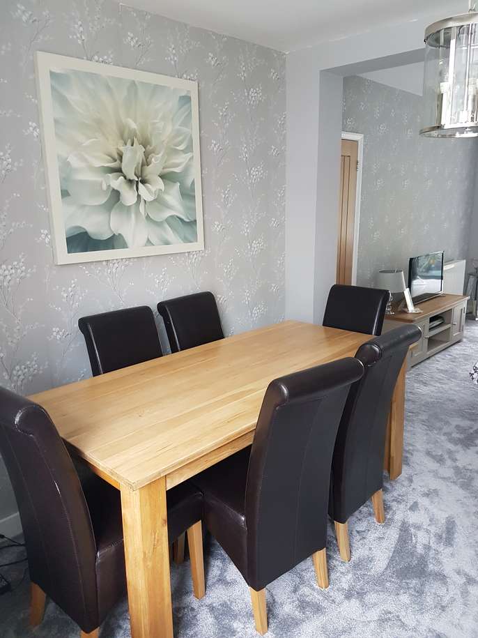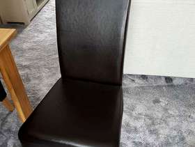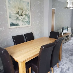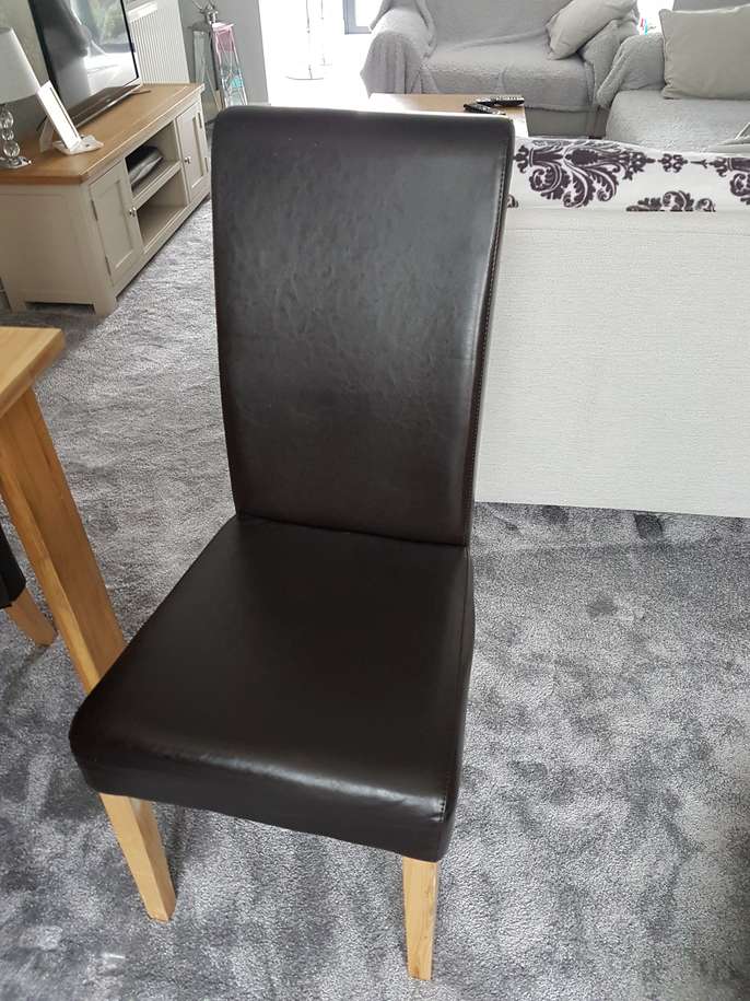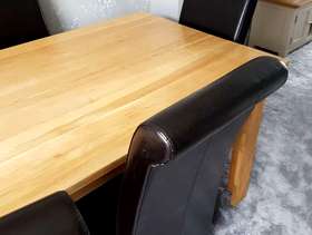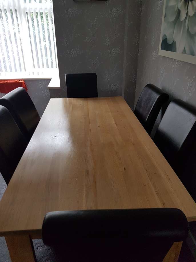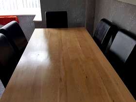 Large (heavy) solid oak table with 6 faux leather high back chairs. Good condition with only slight scratches to chairs. The legs bolt on to the table top, making it easy to transport.