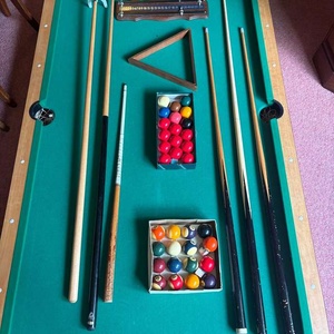 Table top green felt Snooker/Pool table with snooker & pool balls, cues, triangle & score board. In perfect condition from a smoke free home.