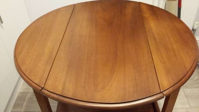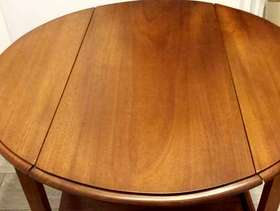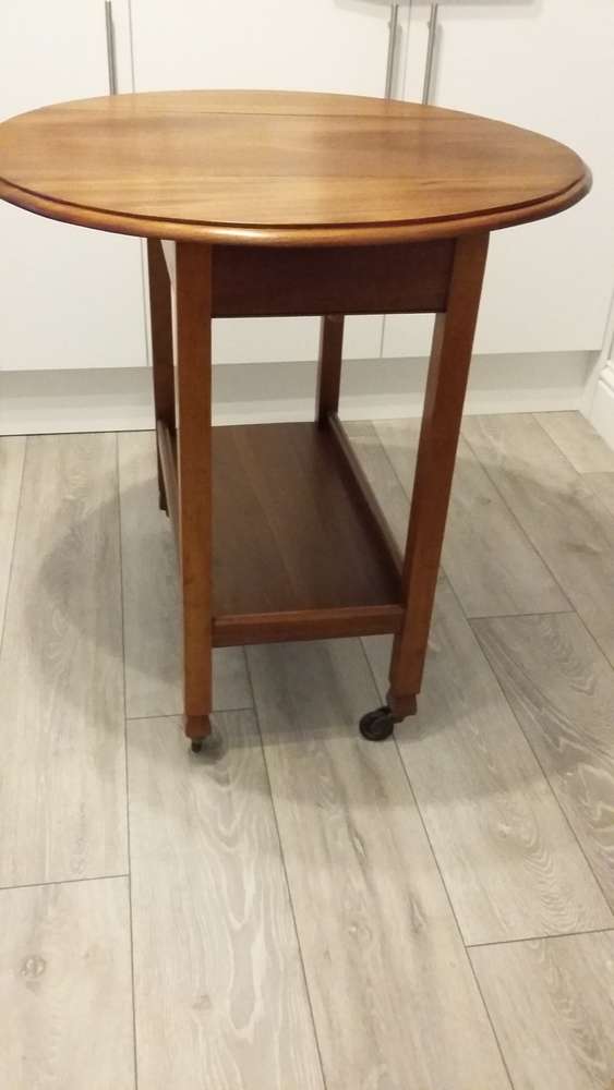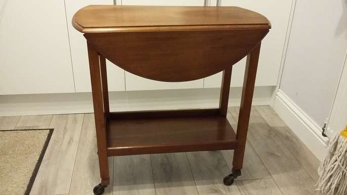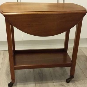Mahogany tea trolley with 2 drop down leaves and swivel top. Useful as a small table, Good condition. Height 78 cms. Length 78 cms, Width with flaps down - 40 cms. Diameter with flaps up 77 cms.