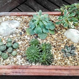 A vintage terracotta bonsai dish planted with 'special' succulents. Echeveria Curly Locks, Lithops, Sempervivum Arachnoideum, Variegated Aeonium and Echeveria Setosa. Pot is 13" long 9 wide. Requires very little attention and watering so one for those of you not too good with plants.