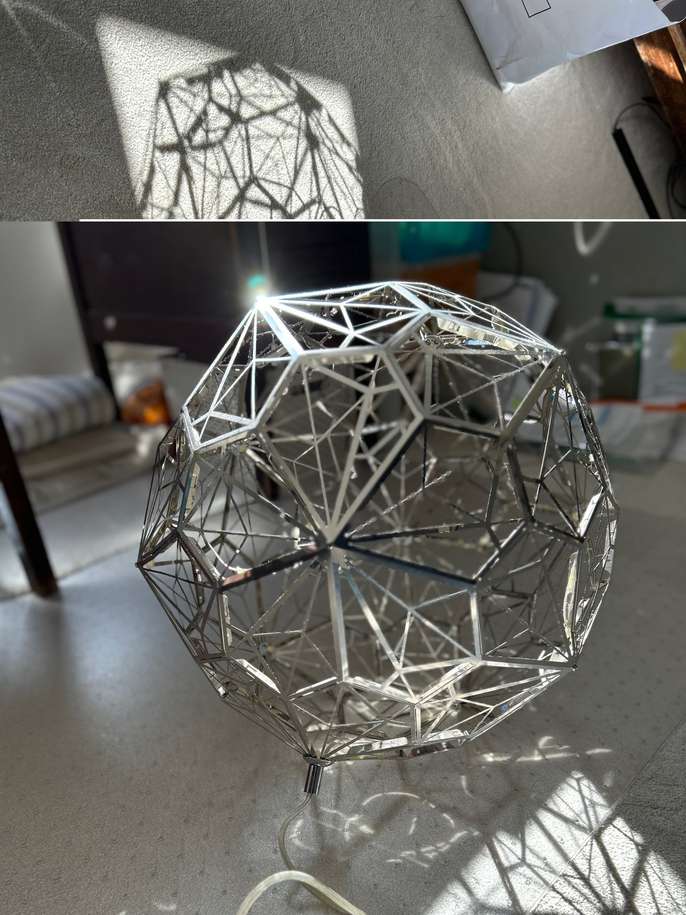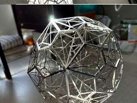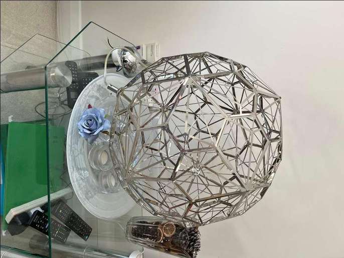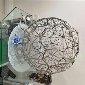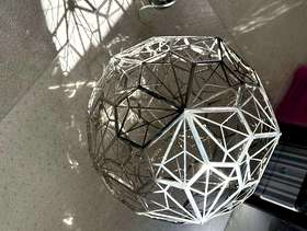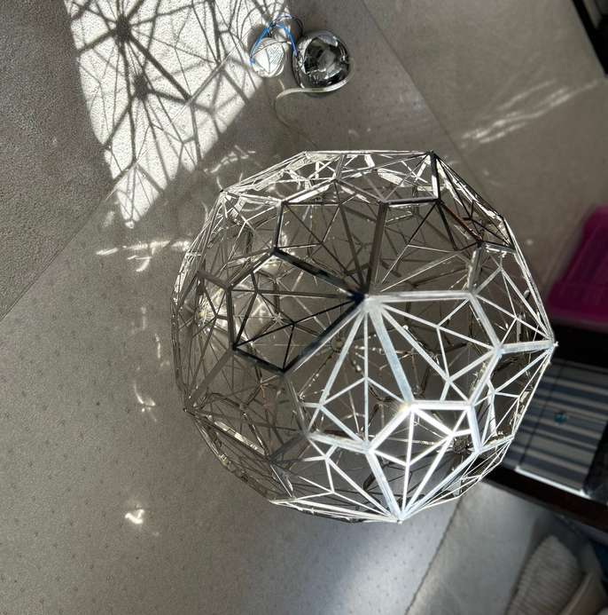Unusual modern, latticed, chrome (shiny) pendant light feature. Suitable for large room or high ceiling as it casts interesting shadows. The ceiling fitting is attached. The sphere of 'the web' is approx. 18" across. One tiny piece of the lattice is missing but is not noticeable as it's at the very top. Collect only TW1.