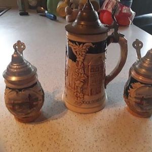 One large beerstein showing Innsbruck scenes and two small showing Lindau Im Bodensee scenes. Good condition.
