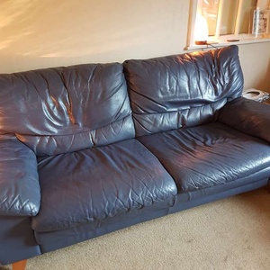 In good condition, nay blue leather sofa, seats three people. can deliver if local.