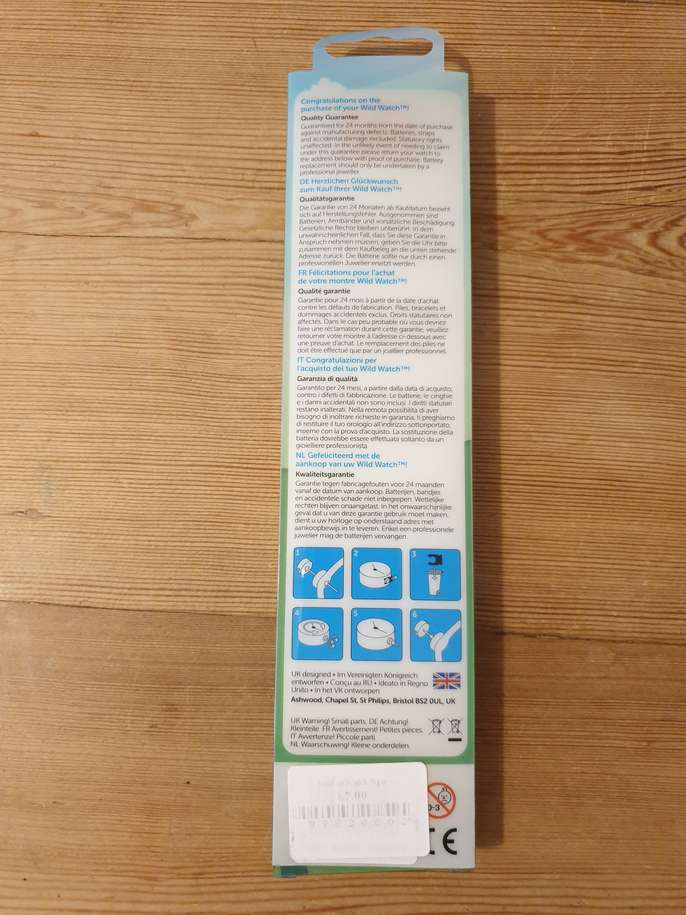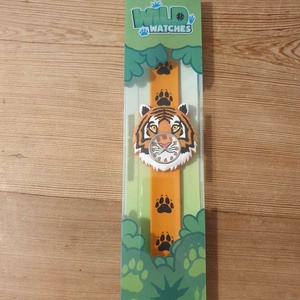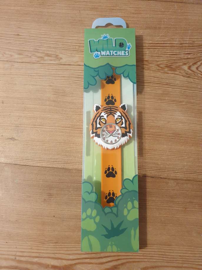 Tiger Wild Watch - Easy Snap Strap Colourful Tiger watch that is easy for younger children to put on. This bright and colourful watch is set within the face of a wild tiger, with the comfortable silicone strap decorated with his paw prints. With no awkward buckle, just snap the fun watch on your wrist and it smoothly wraps around, sizing to the wearer. The perfect way to make wearing a watch lots of fun and encourage little wildlife fans into learning to tell the time. Lovely fun watch, never been used, it has been in a cupboard for a couple of years so not sure if the battery still works. It has the removable plastic strip still around the winder. Many Thanks.