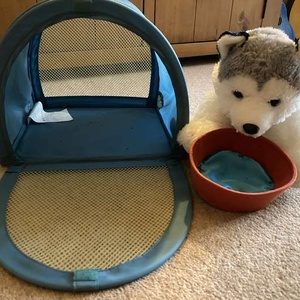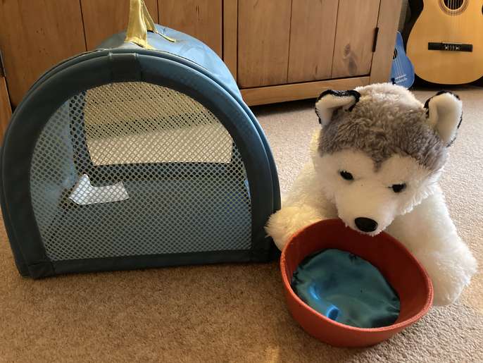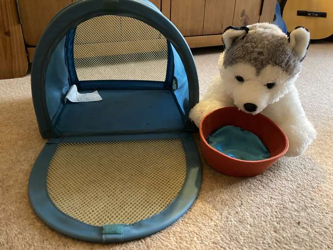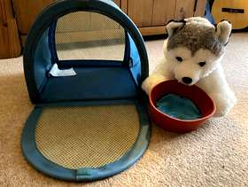 Cute toy dog, bowl and pet carrier. Lovely condition. Loved but no longer played with. From a smoke free home. Collection Poynton.