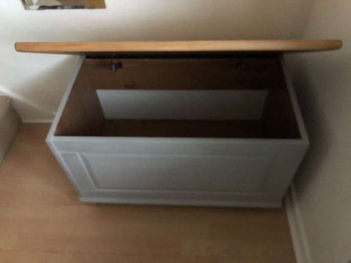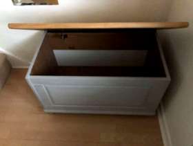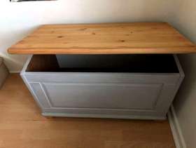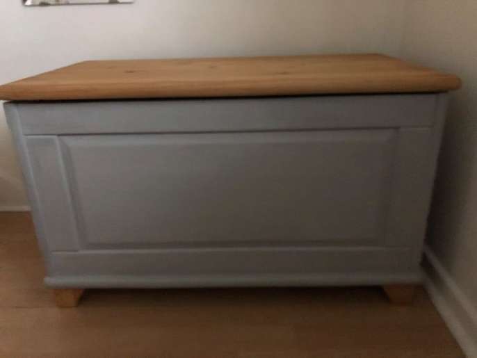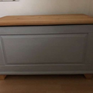 Has been stripped, sanded, chalk-painted in Flint and waxed for protection. Original hinges have been replaced with a piano hinge. Ideal as a toy box as hinges hold the lid in place, so no trapped fingers! 79.5cm long x 44cm wide x 49cm high. 31 1/4" x 17 1/2" x 19 1/4" Collection only from Ash GU12 6PS