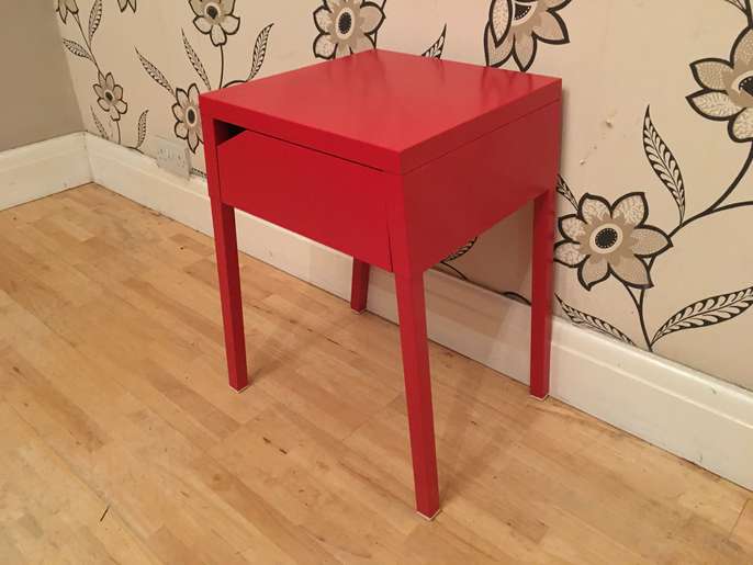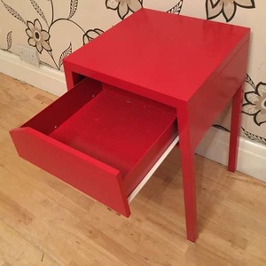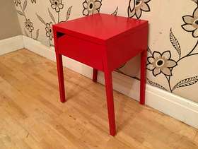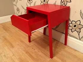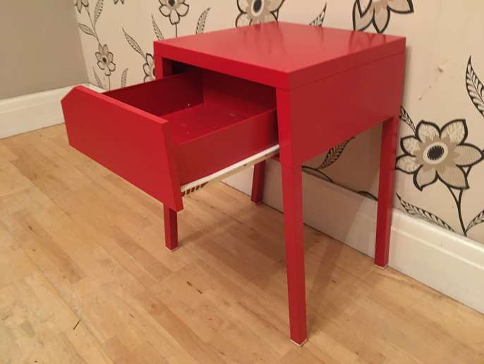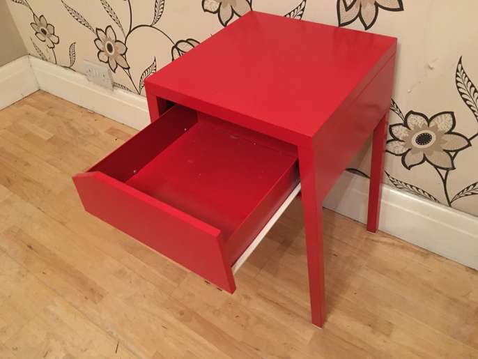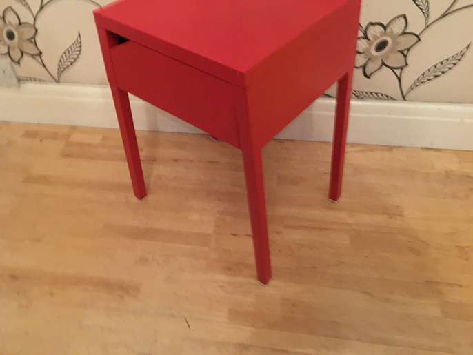 This trendy red metal bedside table has a pull out drawer for storage it stands 56 cm tall and is 35 cm long by 37 cm deep i can deliver to the local halifax/bradford area for a £10 delivery charge