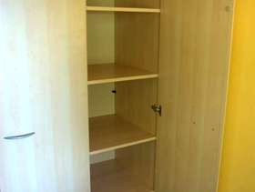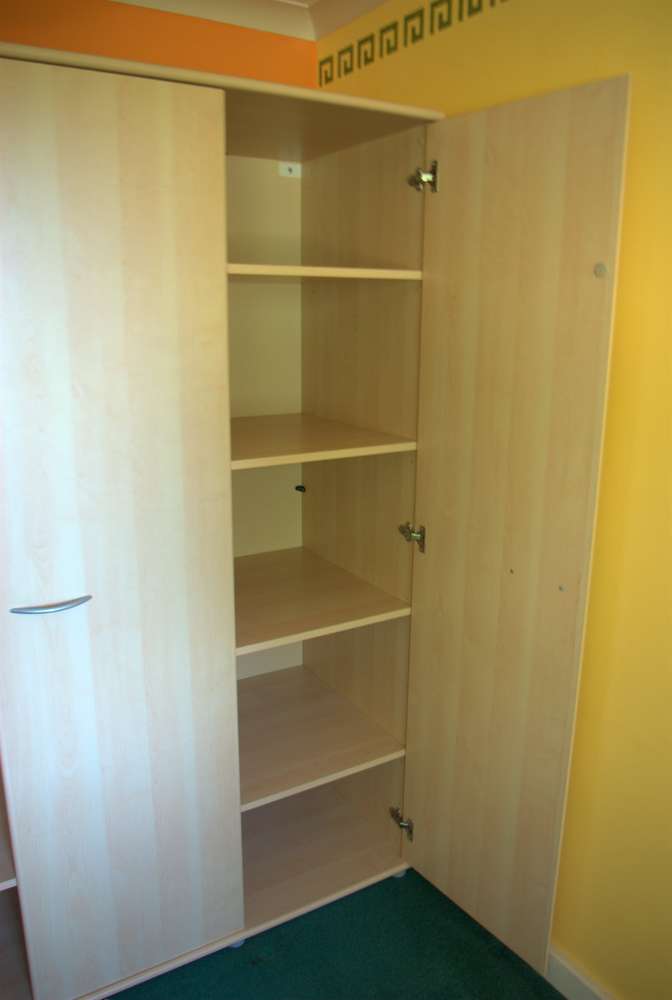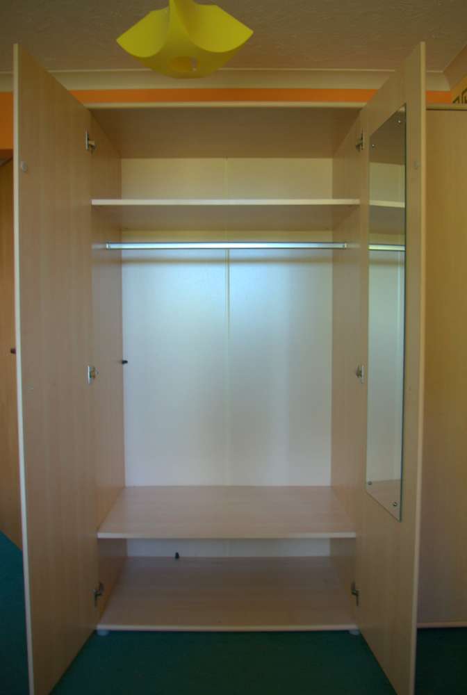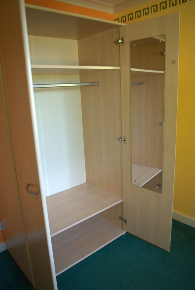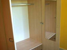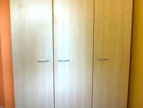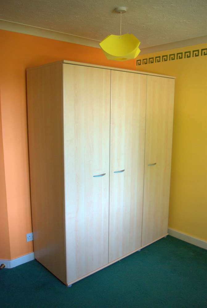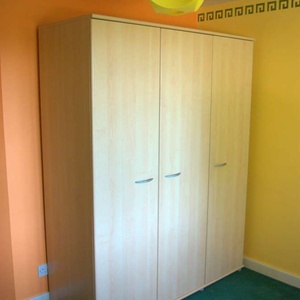 Triple Wardrobe with a mirror inside one door Measurements (cm): 193h x 150w x 60d Modern light maple finish. Generally in very good condition. Some of the door handles have been scratched by having metal coat hangers hung on them, but the handles are a standard size + hole spacing and so could be easily replaced. The wardrobe breaks down / flatpacks for ease of moving, but has been kept assembled for the photos and so you can see it "as is". Most joints are camlocks, but the hardboard back is pinned on and this will need to be removed to dismantle the wardrobe for moving. The buyer is responsible for dismantling the wardrobe on collection, but the seller can assist with shifting the parts into your car when done.
