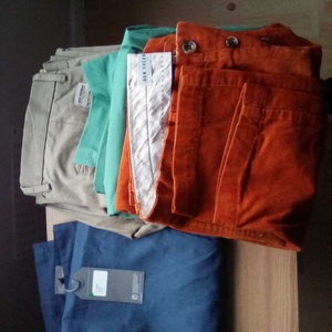 3 pairs of ben sherman trousers Beige chino/green slacks and one pair browish cords. 1 pair unsed Blue All sizes...32/32 4 pairs in total