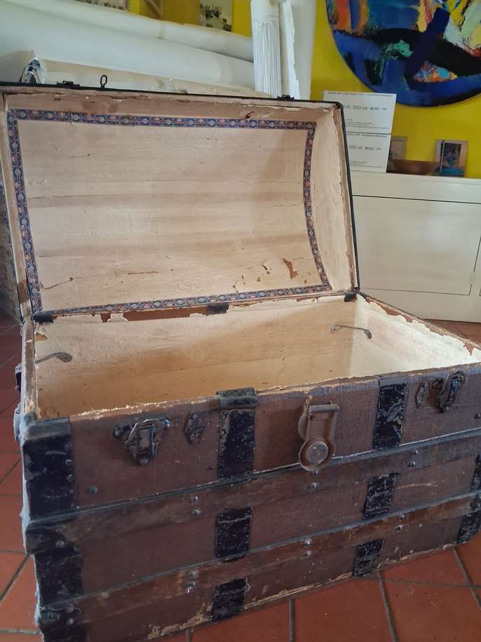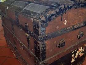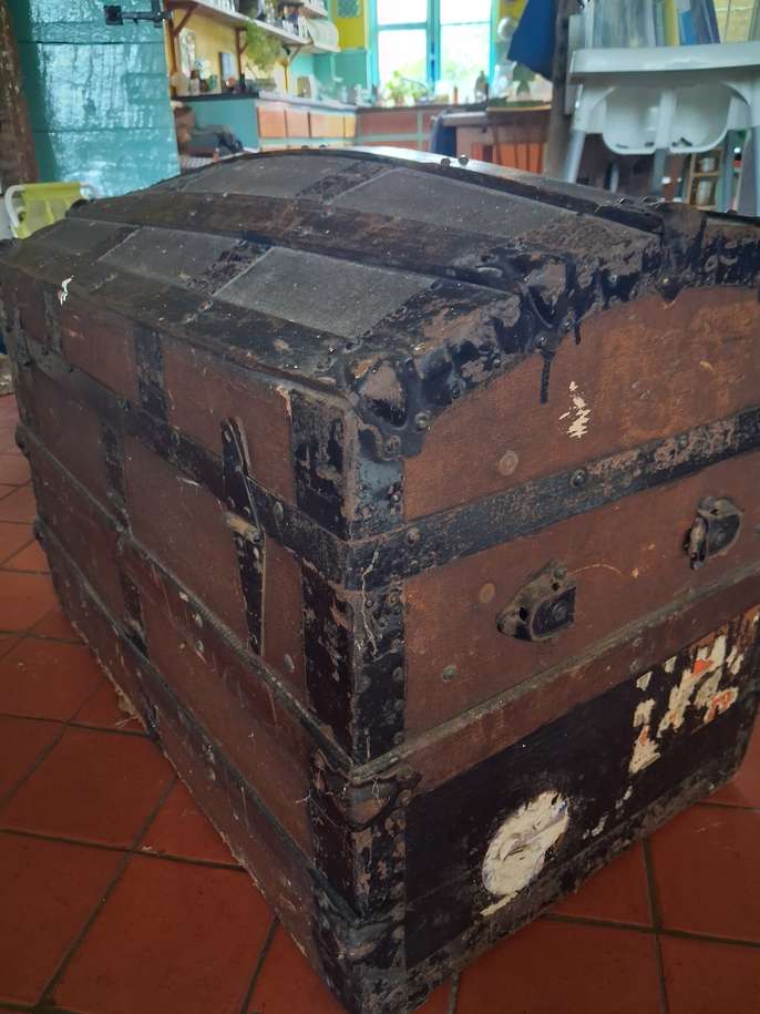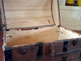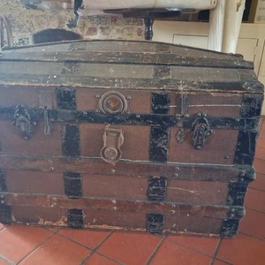 Trunk with round lid with metal bands, no internal compartments; 76 x 46 x 54 (max height) cm. Worn but reasonable condition for age.