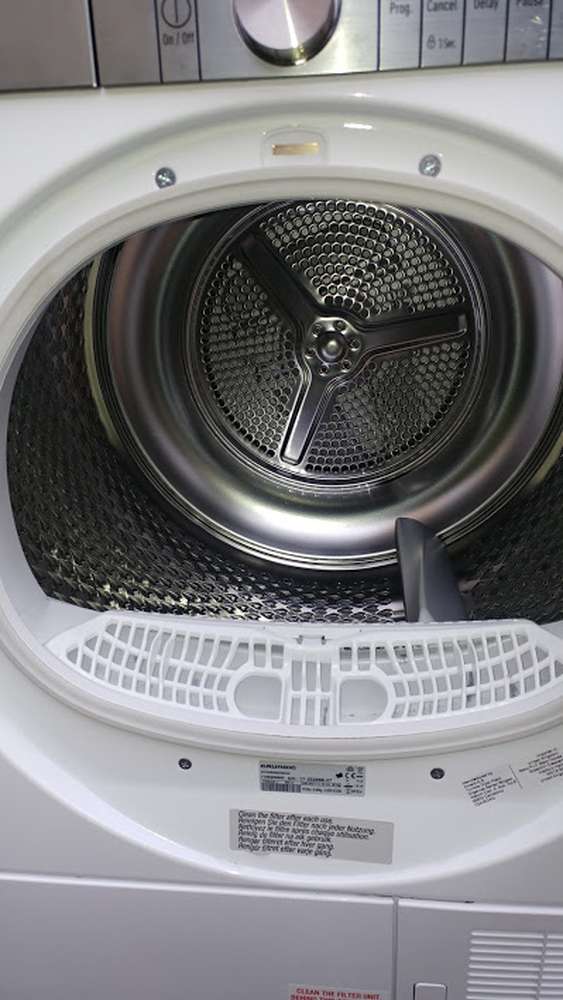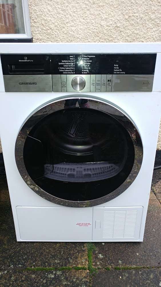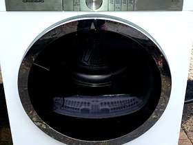 Almost new Grundig condenser tumble dryer. White - Model GTN 838250 HGCW. A++ energy rating, takes 8kg clothes, very quiet. User instructions included. Automatic controls, 14 programme settings & childproof lock. Can pause mid cycle. Width 50.5 cm, D 59.8, H 84.6cm / 86.6cm. Glass front door.