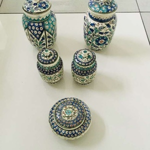 Turkish Pottery Ornaments from Turkey Excellent condition, like new 2 large pots - 20 cm H x 10.5cm D - £15.00 each 2 small pots - 14 cm H x 7cm D - £10.00 each Single flat pot - 12 cm D x 8 cm H - £10.00 Social distancing will be observed
