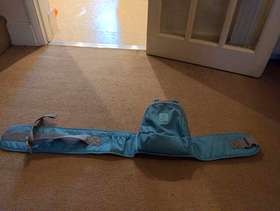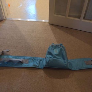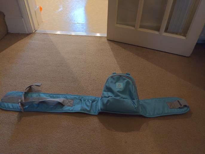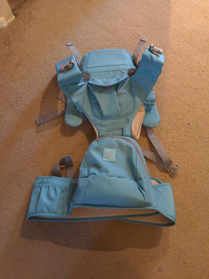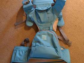 Turquoise baby carrier. Can be worn front facing, chest facing, as a backpack and as a detachable hip belt for support. Two pockets. Brand new. Bought as a gift for us but we had already bought one we preferred. Was £35 new apparently. Brand is Alebao.