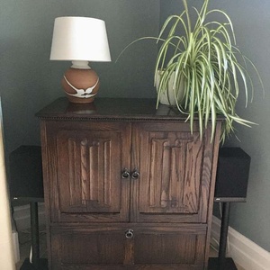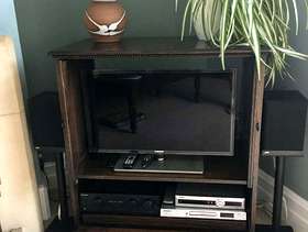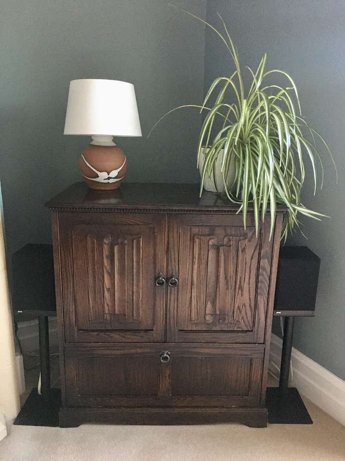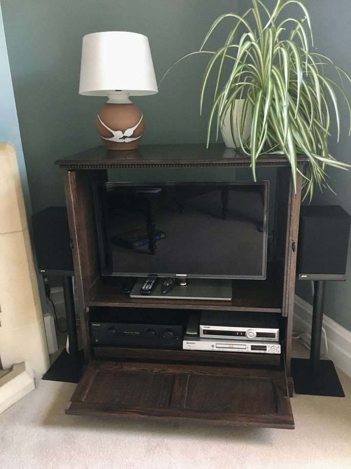 Dark oak TV cabinet. In good condition, no obvious scratches or marks. 94cm wide / 53cm deep / 94cm height. Will take a 32" television.