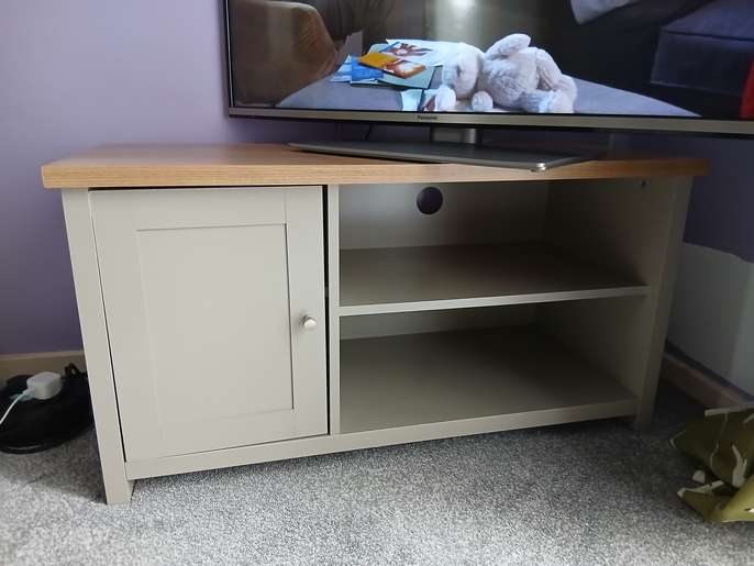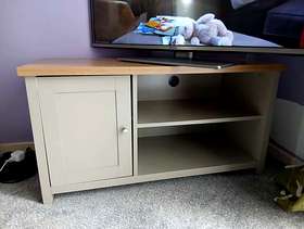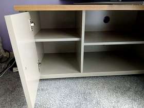 Green TV Unit with shelves and cupboard. 37in W, 19 H, 15 D. Good condition. Cash only please.