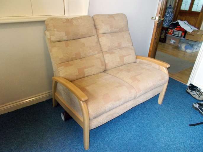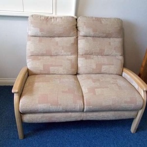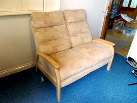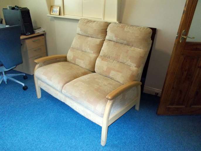 2 seater settee. Ash frame and light brown upholstery. None of the upholstery is removable. It was bought from Camp Hopson. This item has hardly been used as it has been in a home office all its life. The seating is firm and relatively upright. It measures 900mm (3ft) deep x 1250mm (4ft 1in) wide and 1100mm (3ft 7in) high.