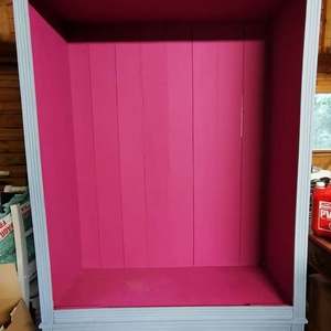 Tall Victorian open wardrobe. Upcycled in Laura Ashley pink and blue. This would make a great place to put some cushions as a reading corner, or in a shop window as a display. This has the holes in it already for a new pole to be fitted. Wardrobe has the original handles. Measurements: 45 inches wide x 81 inches high x 17.5 inches deep. Priced to sell. Collection from Liss only.