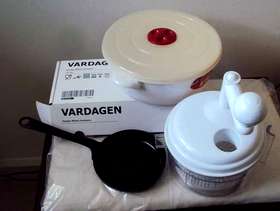 Vardagen 13cm frying pan (Ikea) boxed, plus a salad spinner & microwavable veg/rice bowl with lid