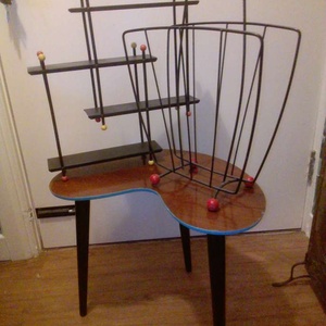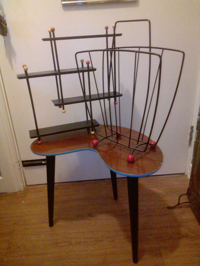 Set comprises X1 kidney shaped, three legged, veneer topped side table, X1 black metal frame magazine rack with red sputnik feet and X1 black metal frame curio/ornament display shelf with sputnik red and yellow accents. Table Dimensions: H - 39.5cm W - 49.5 cm D - 32cm Magazine Rack Dimensions: H - 40cm W - 29.5cm D - 15cm Wall Shelf Dimensions: H - 40cm W - 40cm D - 7cm Please study images carefully as these form part of description. Condition used with some minor scratches commensurate with age. Priority to those who make contact with a number, date and time for collection. ***Will also consider trade/swap for any Edwardian to 1940s items you may want rid of - please message with photo and details in first instance*** CASH ON COLLECTION ONLY