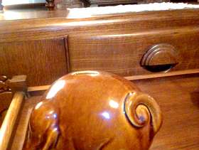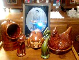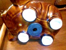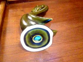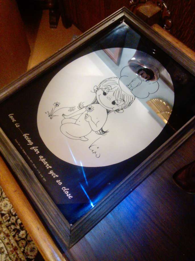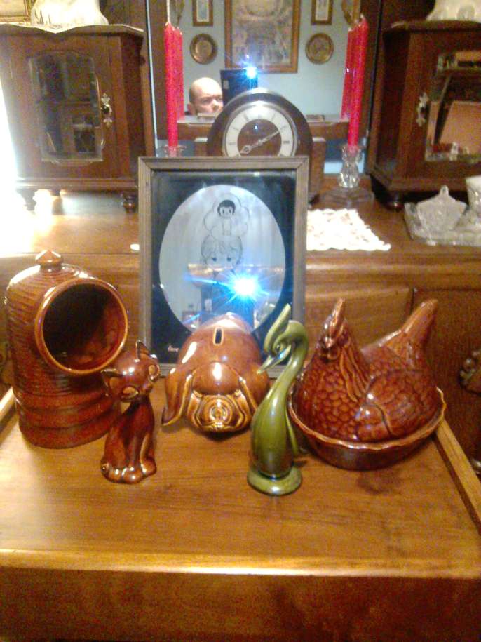 Various 1970's items as follows: #Kim Catreli 'Love Is...' mirror in wooden frame with trademark 1977; #Green glazed ceramic heron figurine - unmarked; #Brown glazed ceramic pig/money bank - unmarked. Note centre of stopper has perished as per photos but still usable; #Brown glazed ceramic cat - marked Denmead on base; #Brown glazed ceramic hen/egg storage - unmarked; #Brown glazed ceramic salt pig/container - unmarked. All items in overall good condition with some minor marks commensurate with age. Please study photos carefully as these form part of description. ***CASH ON COLLECTION ONLY. Priority to those who make contact with a number, date and time to view/collect. Please also see separate listing for black 70's rotary dial telephone.***