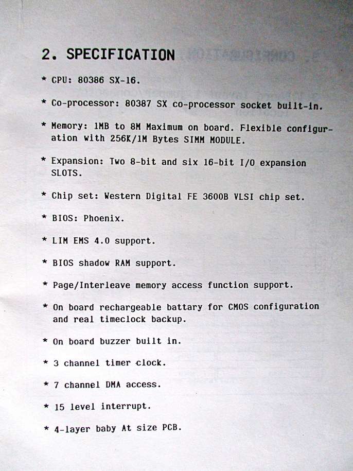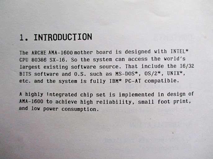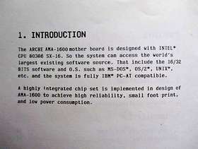 VINTAGE ARCHE AMA-2000 386SX-16 MOTHERBOARD – UNTESTED A rare vintage motherboard with Intel 80386 SX-16 CPU complete with User’s Manual. See photos for full specification. This card was in working order when removed from a PC some years ago (and has been in storage since) but I do not now have the facilities to test it so it is “sold as seen”.