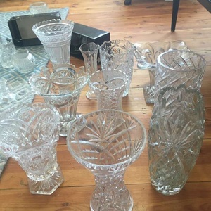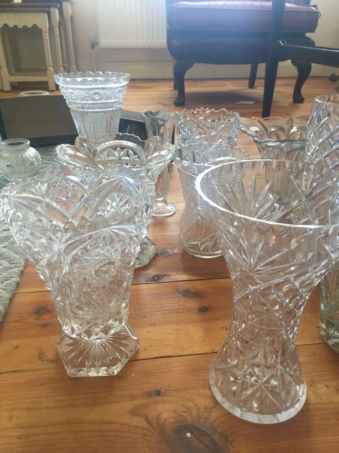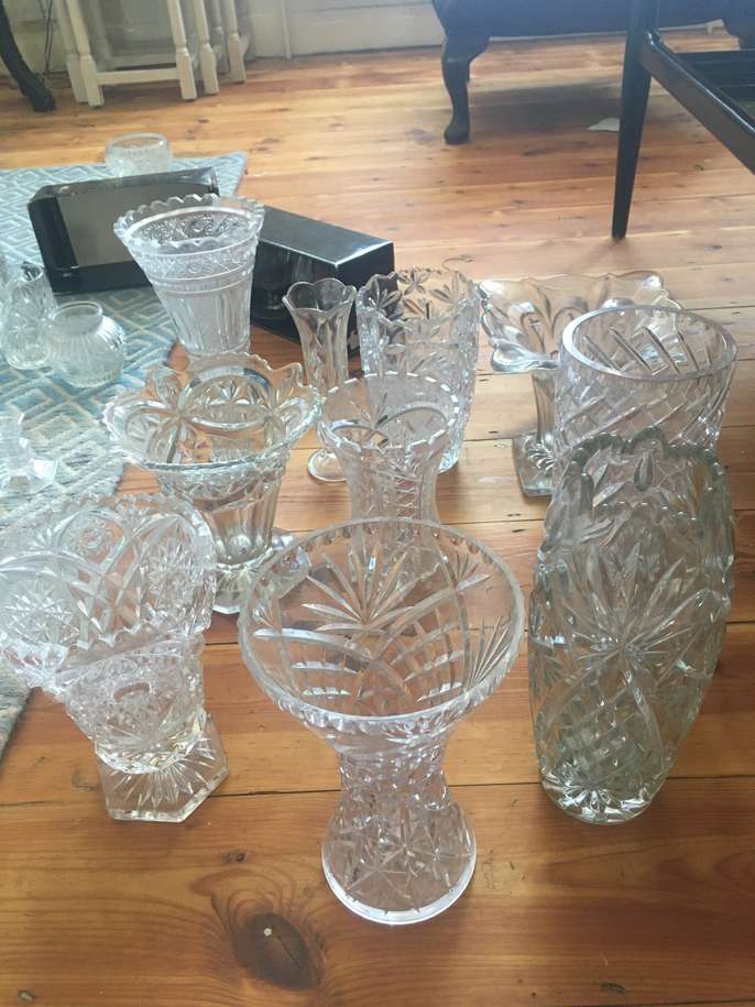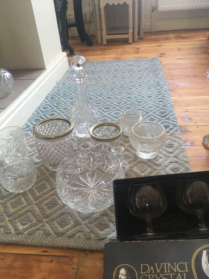 My mum Collected cut glass items for many years. Now she has no need for them. There is a selection of vintage decanters, bowls, glasses, vases Collection from Romford or maybe East Barnet £5 for smaller items £10 for larger ones
