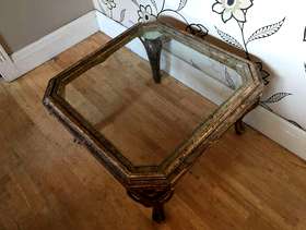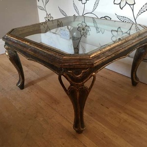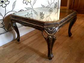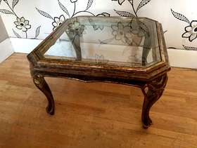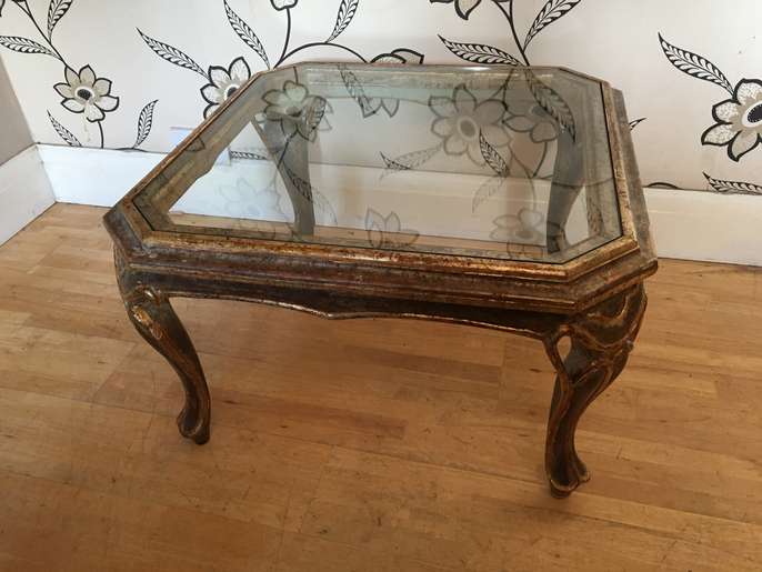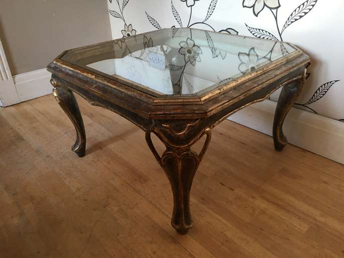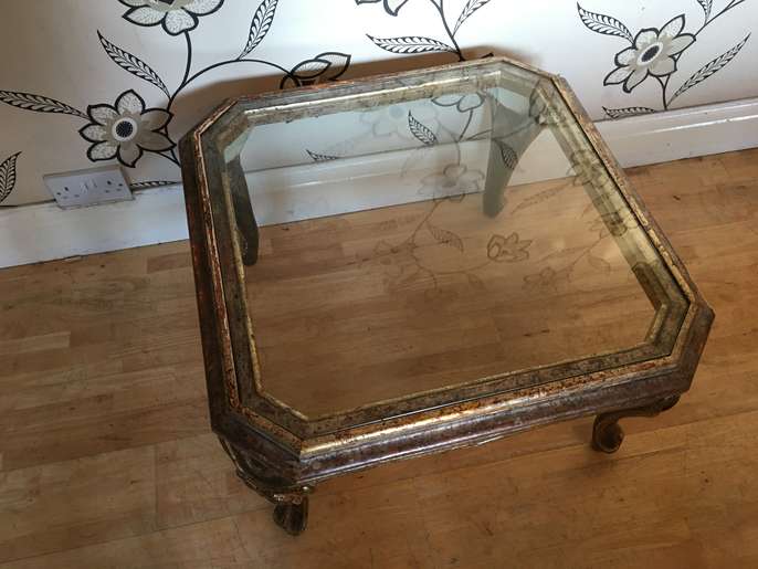 this lovely distressed gold effect glass topped coffee table will make a lovely focal point in a room it stands 42 cm tall and is 72 cm square i can deliver to the local halifax/bradford area for a £10 delivery charge
