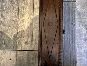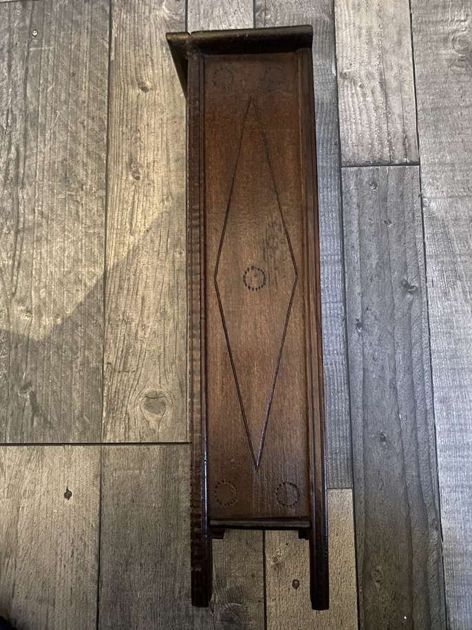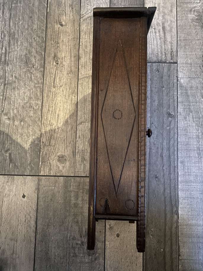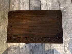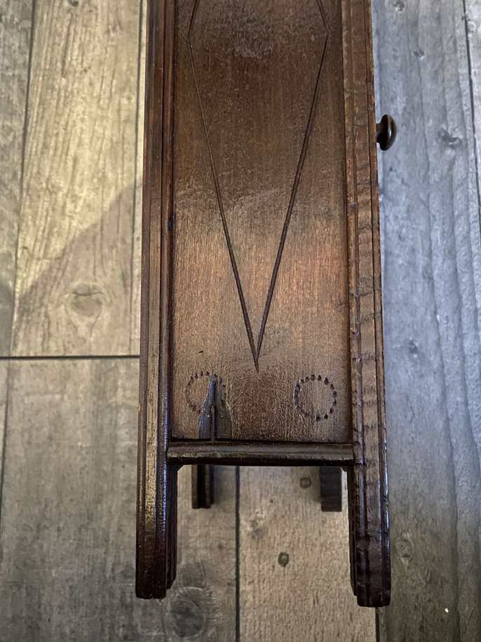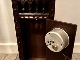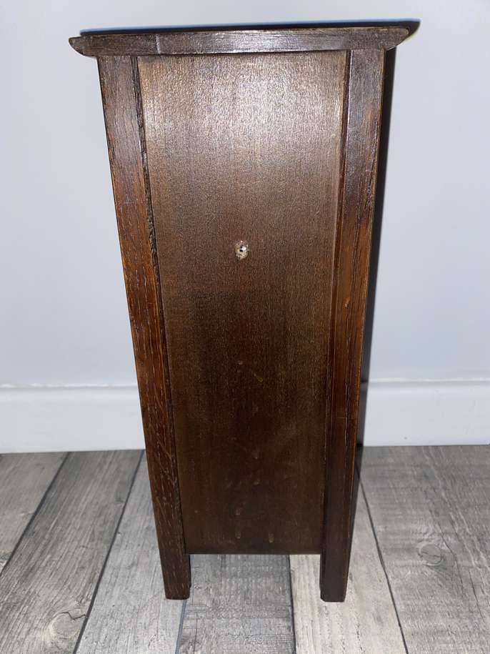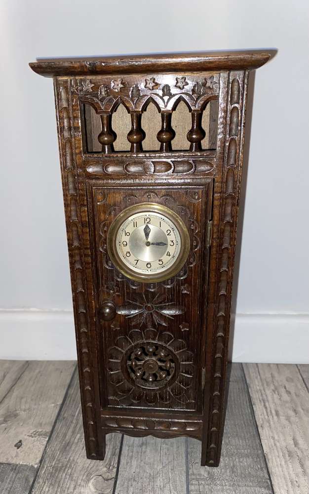 Beautiful handmade wooden crafted piece of furniture 1950 era It does close with a latch Slight damage on 1 side and top as pictures show. The clock does not work. Size: H : 0.36cm W : 0.15cm D: 0.9,5cm