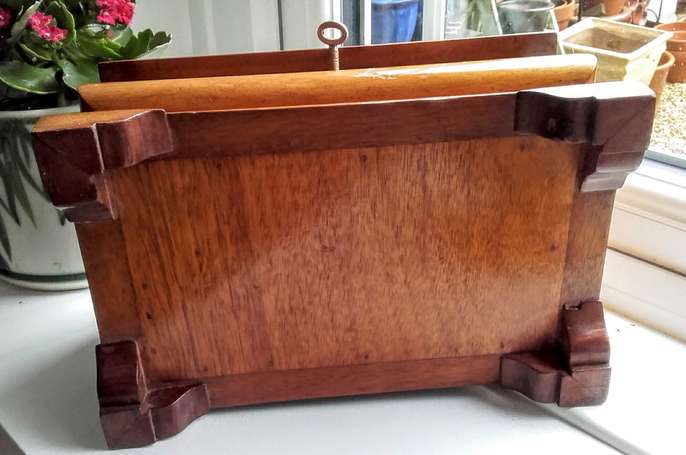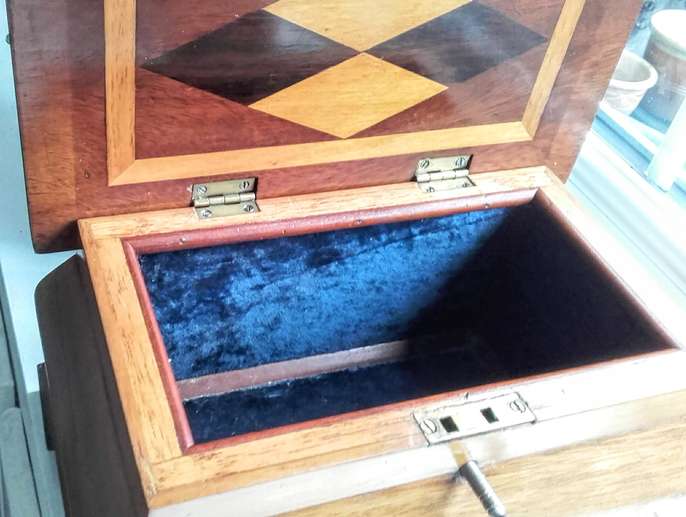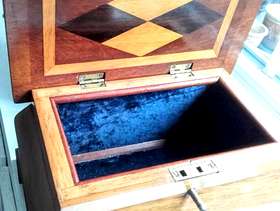 A really pretty inlay marquetry trinket box which is hand made and complete with key. 26cm long 16 wide and 15 high