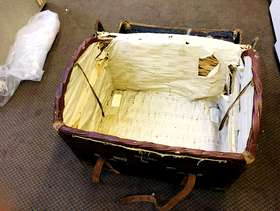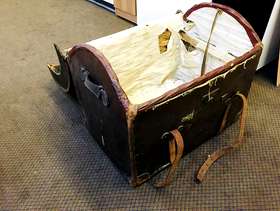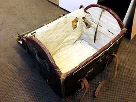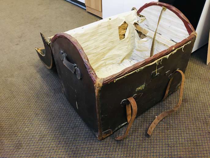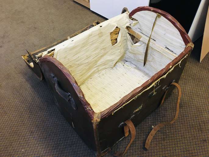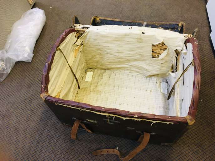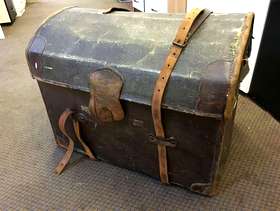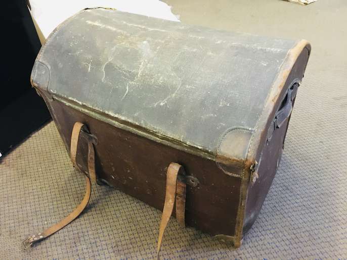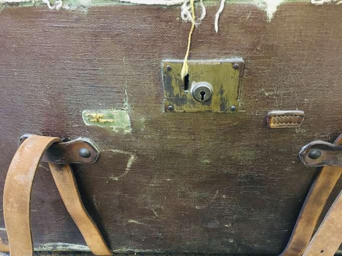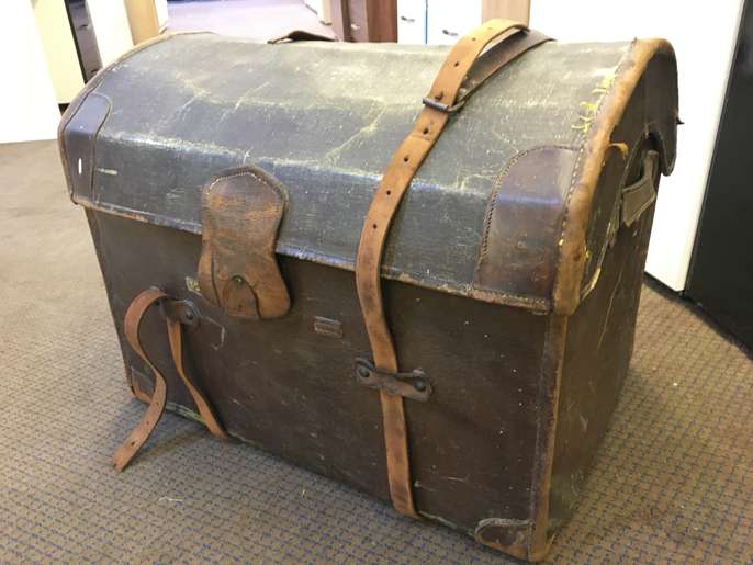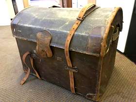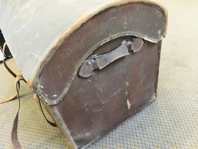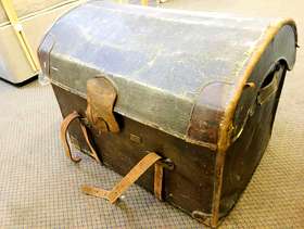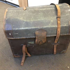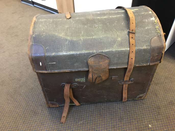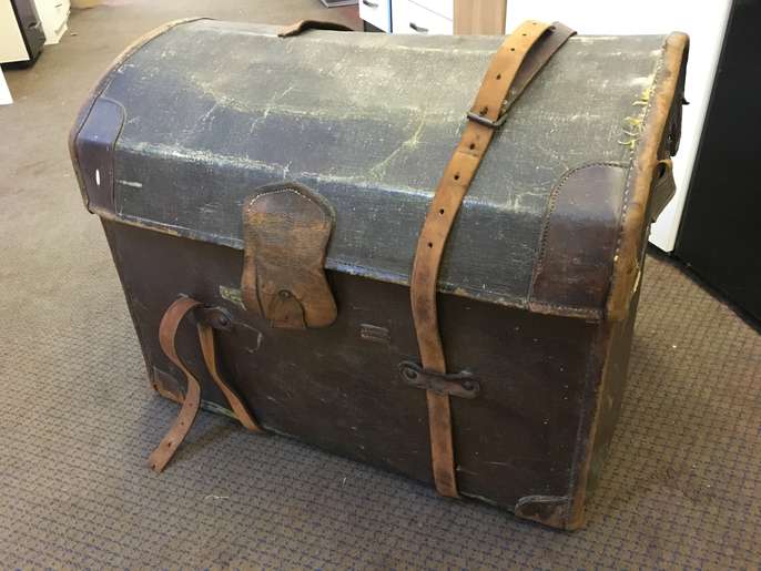 This is a lovely traditional brown leather trunk is from years gone by one of the leather straps has lost its buckle the trunk is 77 long 55 cm wide and stands 60 cm tall perhaps ideal for a shop window display or a prop in a play? i can deliver to the local halifax/bradford area for a £10 delivery charge