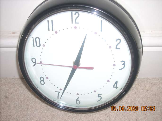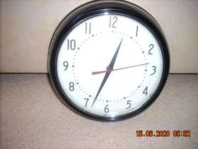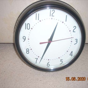 FOR SALE . Retro style hanging wall clock with second hand . Dark black/brown case with red features . 20 cm across . Brand new working with battery .