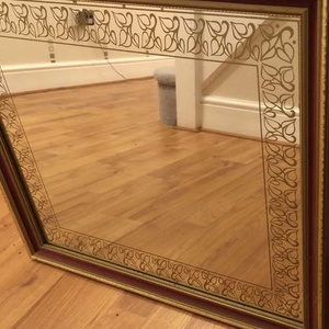 Mirror with gold frame and pattern on glass, ready to hang. 55cm x 47cm. Good condition. Collection from Sunninghill.