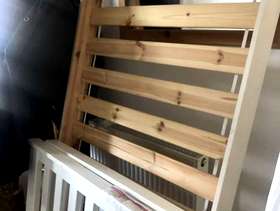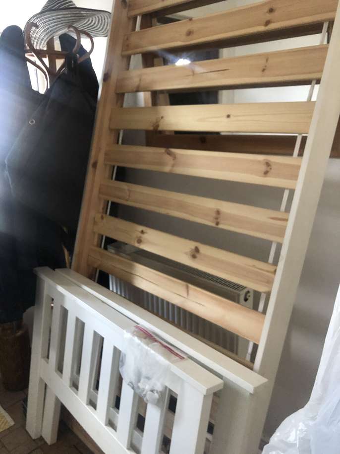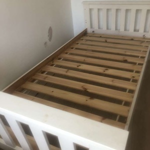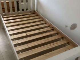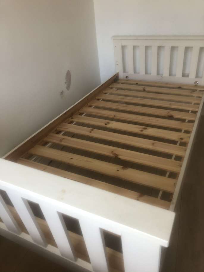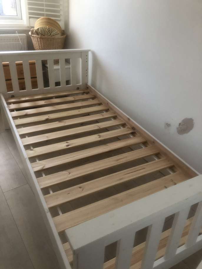 Painted white wooden single Bed. Some fixings missing and a few marks. Someone who knows what they’re doing should be able to rectify . Collection from Romford RM5