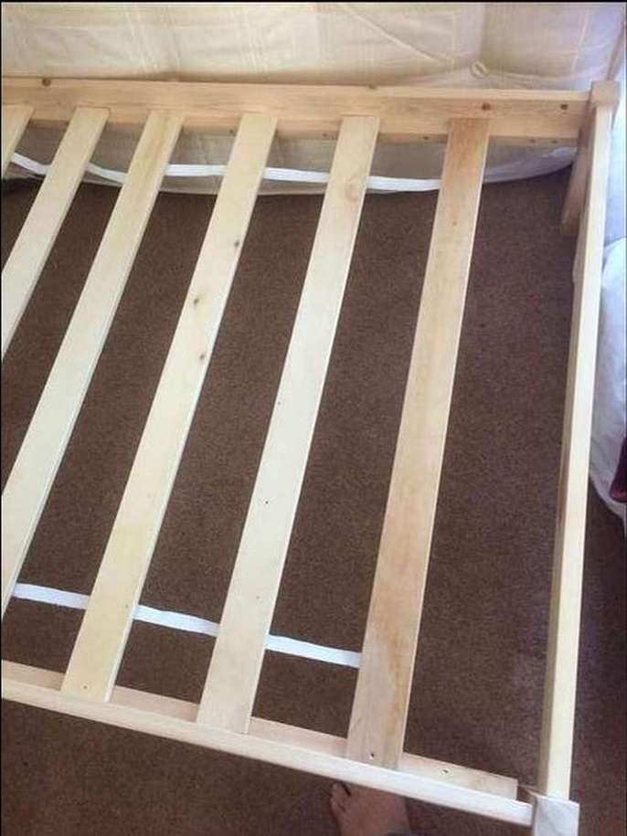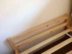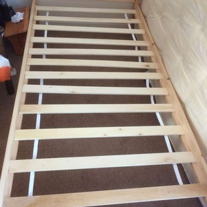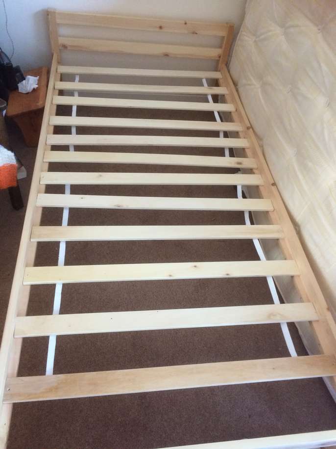This is a simple wooden bed with springy slats. It has been dismantled for transportation, and is very easily put back together with an Allen key (supplied) and a Philips (cross-head) screwdriver. The screws and bolts are supplied - there are a few odd screws missing for fixing the slats to the frame but they are not essential. Hardly used, in very clean condition. I can deliver the dismantled bed in an area around Northallerton/Durham/York for the cost of fuel. Or it can be collected from Northallerton. If requesting delivery, please contact in advance to discuss arrangements and possible available times.