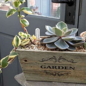 3 different succulents planted in a wooden container. Ideal for a bright window