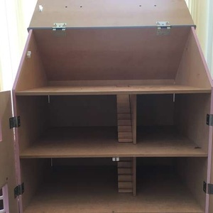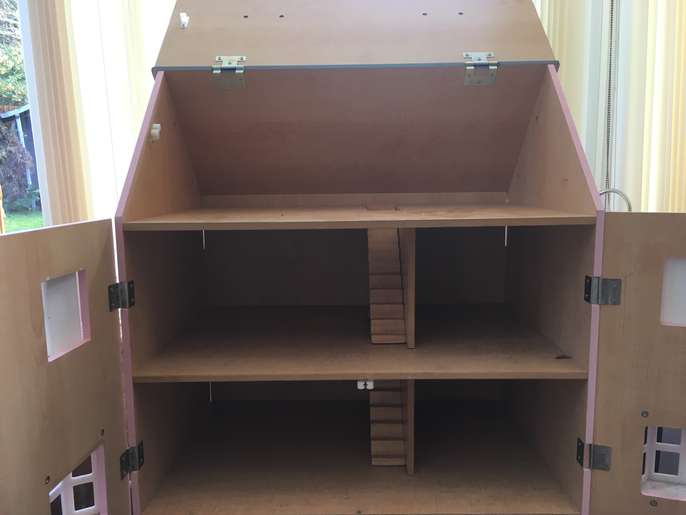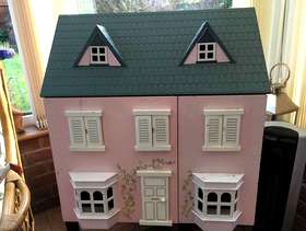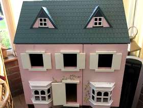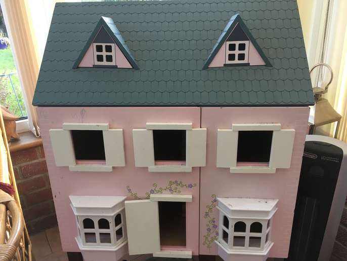 Pink and Blue dolls house with plain wooden interior. Hinges and catches all working and straight. 3 years old but not used now. Very good condition. 63cm wide by 62cm high by 40cm deep. No furniture but Asda sells quite cheaply. £25 needs to go as soon as possible. Can be delivered at extra cost.