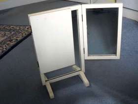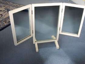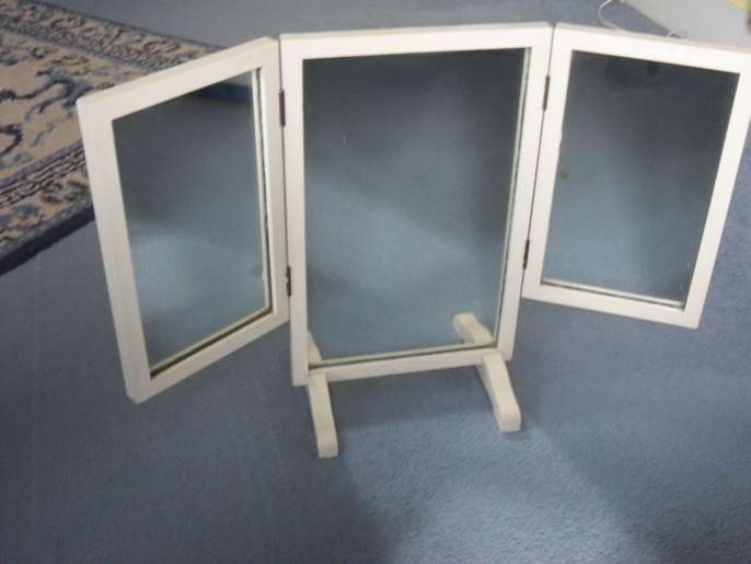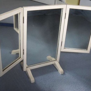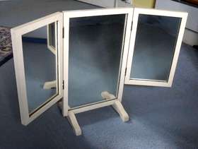 Wooden folding mirror (1960s) for a dressing table. Height 46cm Width when fully open 69.5cm Main mirror width 27.5cm Side mirror width 21cm Side mirror height 35cm Depth 21 cm Collect from Chiswick London