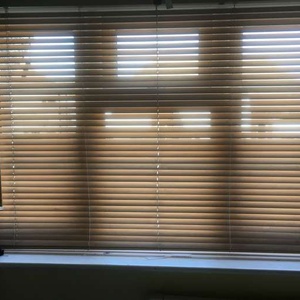 Oak wooden blind. 5ft wide by 4ft deep and 1inch slats. Brackets all good. Good condition and good working order. I'm told that the size is adjustable. 07957 603 705