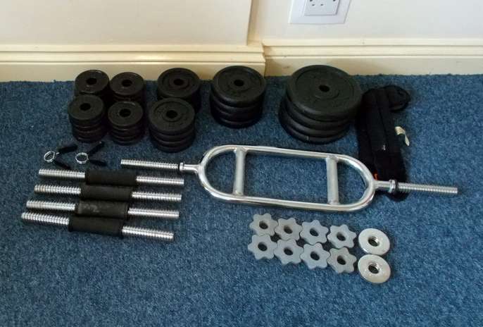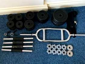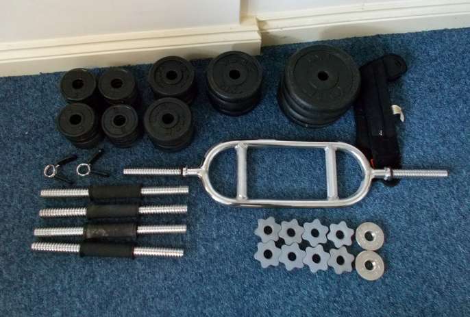 York 1" Weight Plates - cast iron weights 4 x 5kg 4 x 2.5kg 8 x 1.25kg 23 x 0.5kg 4 x dumbells 1 x Easy Bar 10 x screw collars 2 x 1kg wrist cuffs