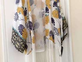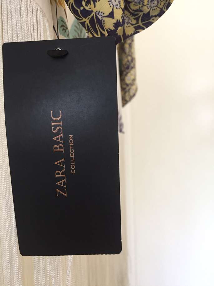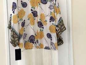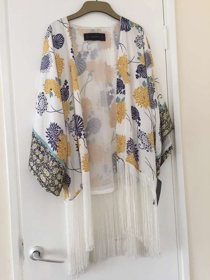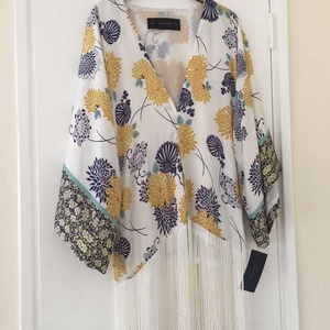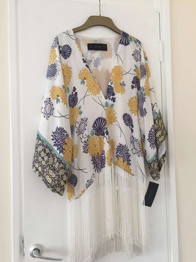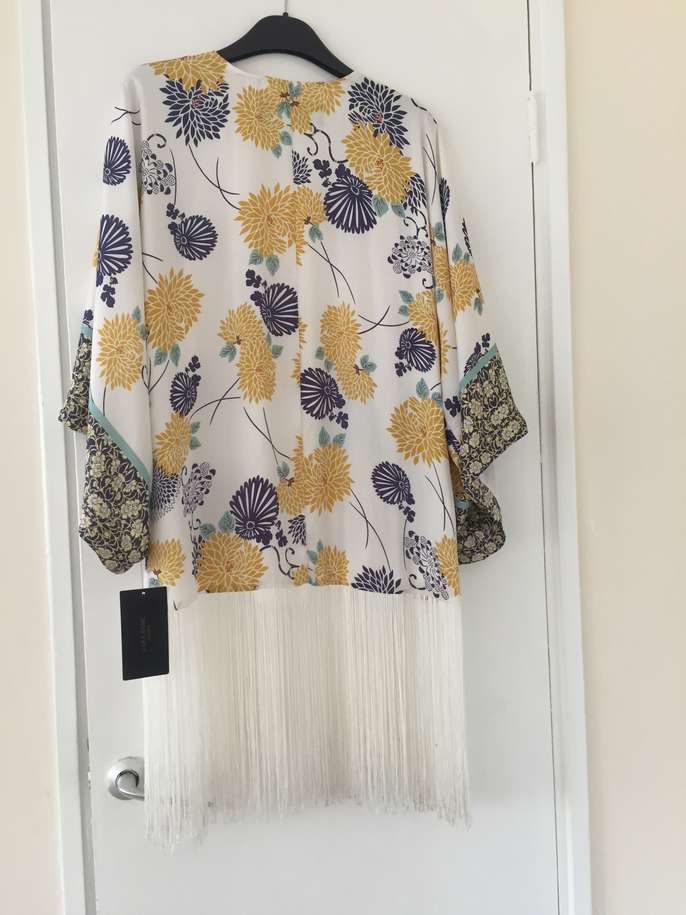Brand new Zara Basic Collection Kimono Top fully lined - UK small / size 8 - 100% viscose - background colour white with floral print in gold, navy, turquoise, berry with long white fringing. Priced at £59.99, reduced to £49.99 and offering at less than 50% of reduced price. Never been worn. Cash and collect.