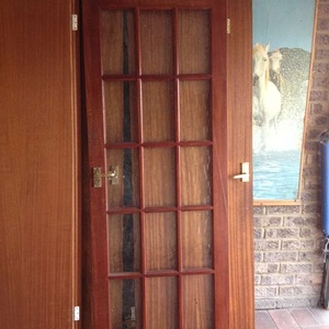 This door is solid mahogany with 15 glass panels. It comes with 3 hinges and handle. It is (almost) too heavy for me to lift on my own. Dimensions: 76cm by 198cm Regards, Barry