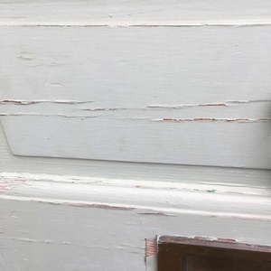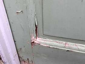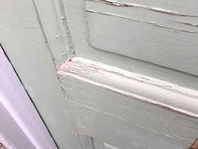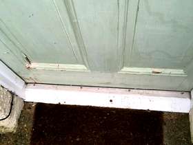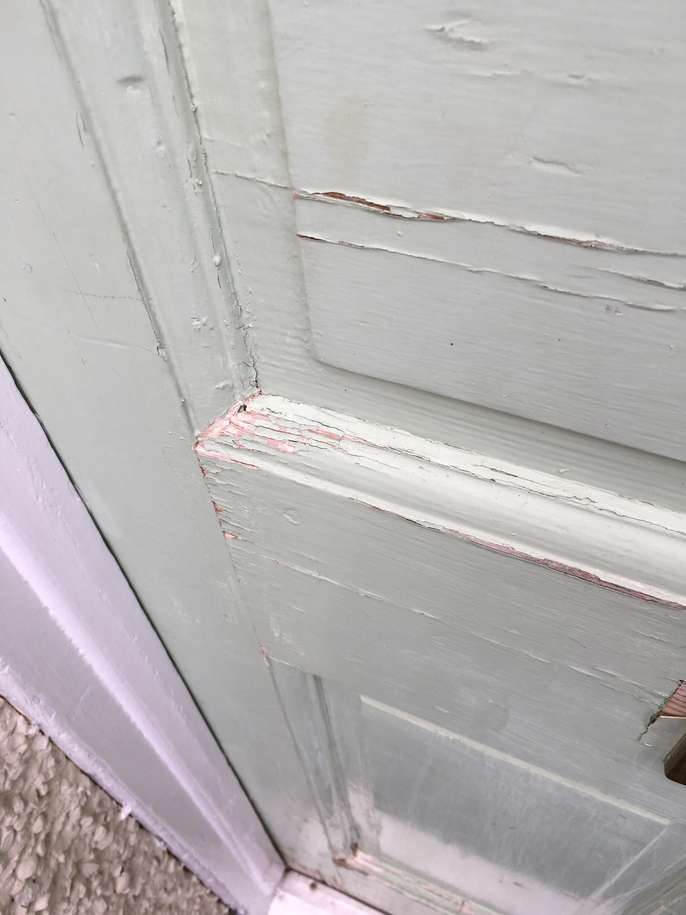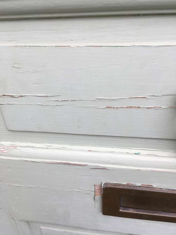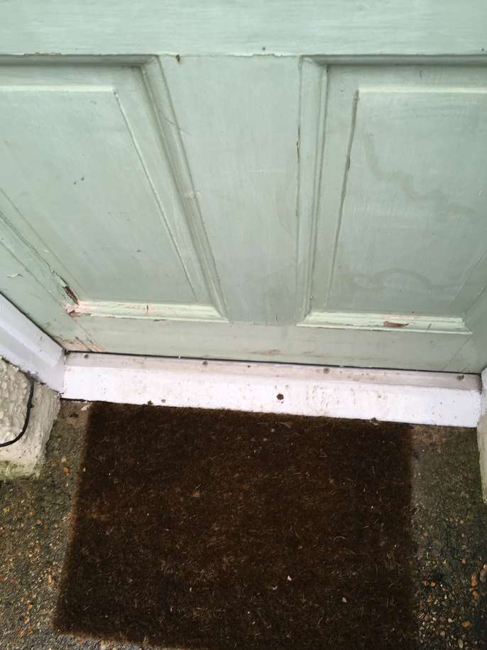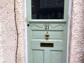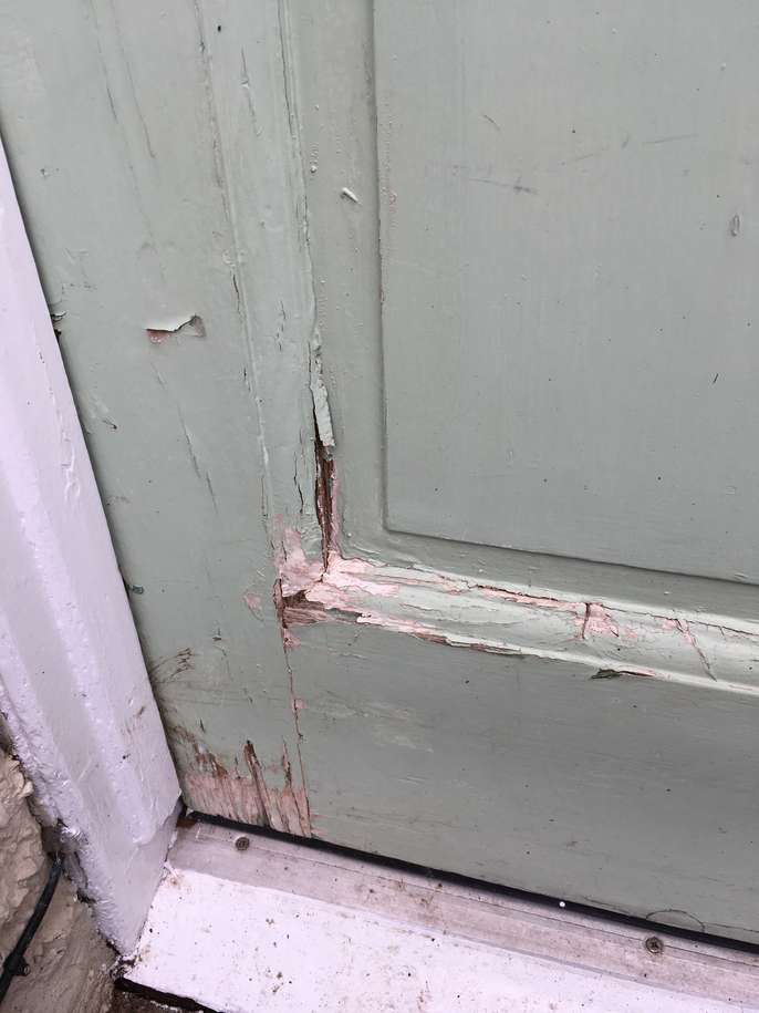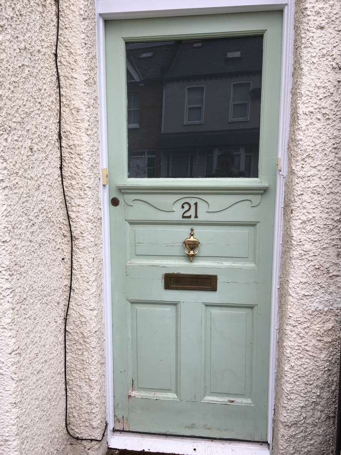 Front door, painted green with frosted glass single glazed panel. In fairly poor condition on the external side at the bottom with brass numbers and letterbox. Must be collected.