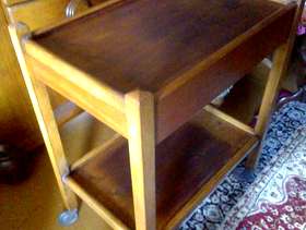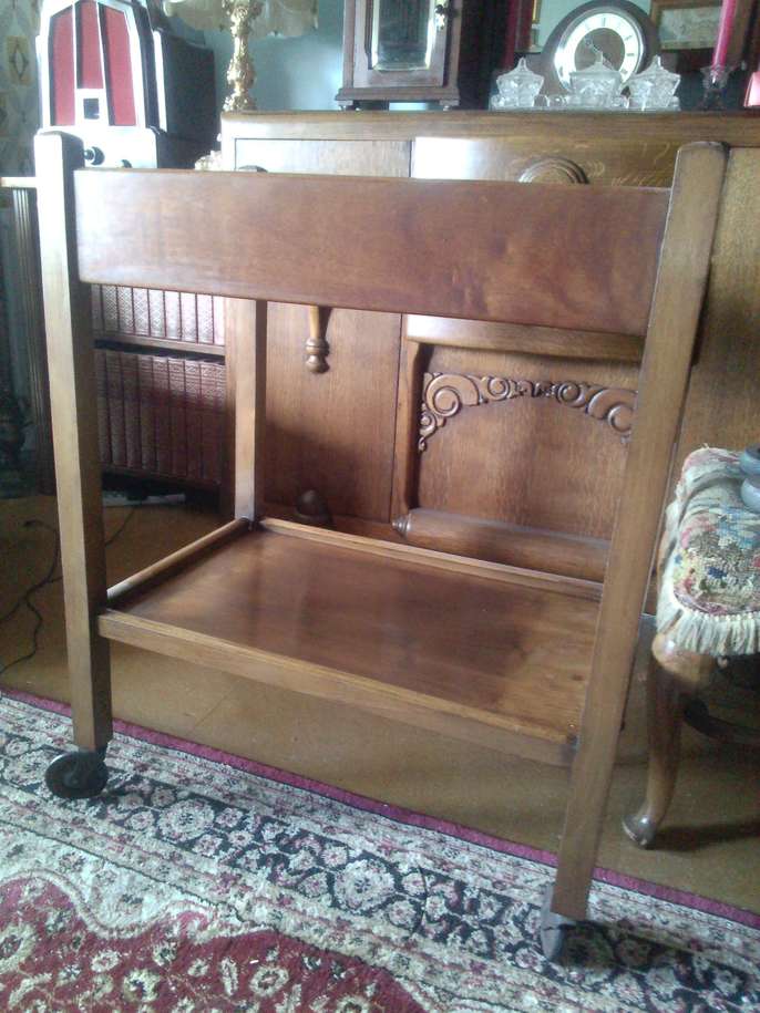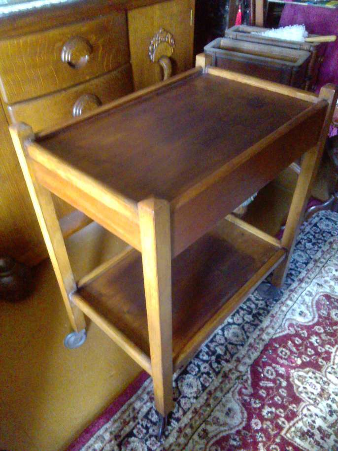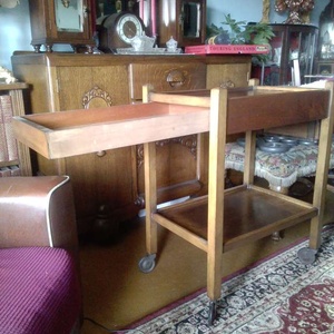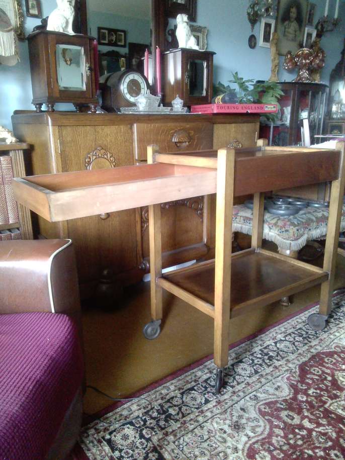 1930s/40s extendable trolley with original castors. One stain to top shelf as per photos, but this could easily be sanded out or covered. Some very nice grain throughout. Overall, a very nice example of utility-ware of the time. Dimensions: H - 77cm W - 60cm D - 39cm ***Priority to those who make contact with a number, date and time to collect***