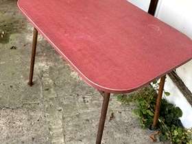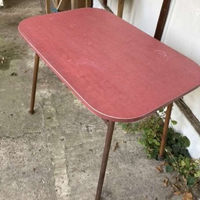 Original 1950s red formica kitchen table. Well used - though the formica top is in good condition, the legs are a bit rusty now from being used outside but with some TLC it could easily be restored to its original glory. Or be used for craft projects as it is now. Top 36 inches x24 inches 30 inches high.