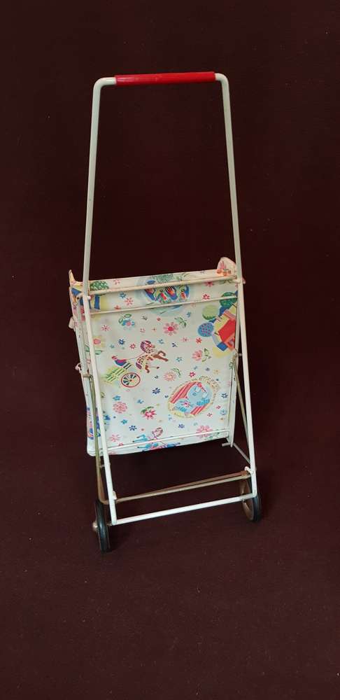 Childs dolls push chair. The fram wheels detatch leaving an adjustable seat with carry handles. Finished in 60's brightly patterned vinyl covering.