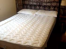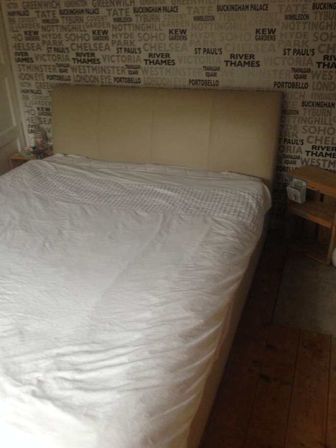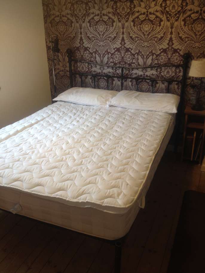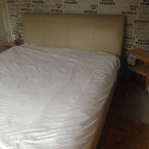 1 x off white leatherette king size bed with good mattress. 1 x steel frame sprung base with victorian style headboard. Standard double. Only available until Monday morning.